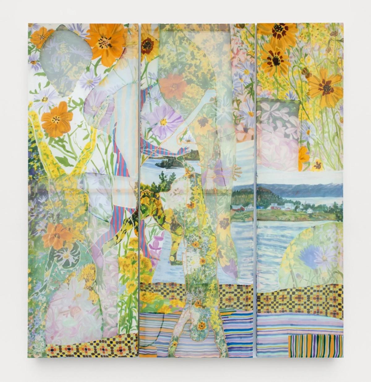 Artist Lauren Luloff has a unique style of painting. Using silk fabric and dye, she creates innovative mixed media paintings that range from watercolor-esque to vibrant and hard-edged. Luloff’s silk dyeing technique uses a complex process of dyeing, drying, stretching, and setting to lock the bright colors in place. It was a technique she learned from her fellow artist; after attempting to paint by dyeing silk for the first time, Luloff learned that the silk would wrinkle if it was not dried in the correct setup. This led her to reach out to another textile artist in order to learn how to properly dry dyed silk, which is what formed her current artistic style as we see it today. Four of her pieces are on view at the Schneider in Heiter Gallery as a part of Jason Stopa’s curated show, “Angel of History”. Though not all of her work focuses on landscapes and nature, the works on view all depict florals and foliage, a reflection of Lauren Luloff’s time spent staying on the East Coast. On this visit, she chose to immerse herself in nature and be inspired by the shapes found in flowers, trees, rivers, and hills. Previously, she had been in a major metropolitan area, and her paintings from around that time are very gridlike and geometric. Both of these elements are found in the works on view at the Schneider, as Luloff tends to combine natural and manmade elements of inspiration in her artwork. Learn more about Lauren Luloff and her artistic process in this interview below from Hamptons Art Hub, and visit the Schneider Museum of Art to see some of her works on view!