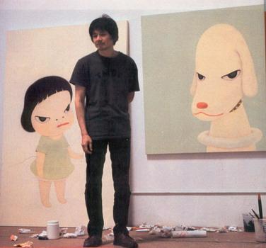 | | Yoshitomo Nara with his works The Little Ambassador, 2000, acrylic on canvas, and Pale Mountain Dog, 2000, acrylic on canvas | |